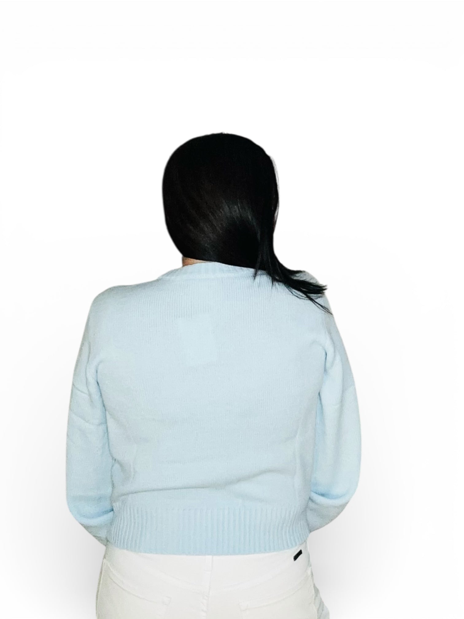 Soft, feminine, and effortlessly modern, this lightweight knit sweater brings elevated charm to everyday dressing. Designed in a beautiful light blue hue, it features intricate white floral embroidery across the chest and sleeves for a fresh, eye-catching finish.